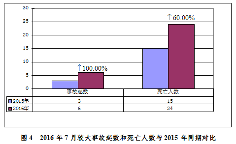 In July, 2016, there were 6 major accidents and 24 deaths in the production safety of municipal housing projects in China, which increased by 3 accidents and 9 deaths compared with the same period of last year, up by 100.00% and 60.00% respectively (see Figure 4).