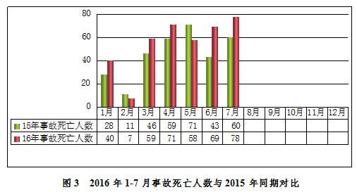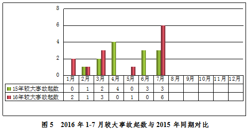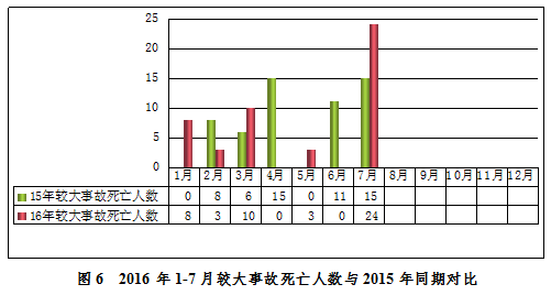 From January to July, 2016, there were 13 major accidents in the production safety of municipal housing projects and 48 people died, which was the same as the number of accidents in the same period last year, and the number of deaths decreased by 7 people, down by 12.73% year-on-year (see Figures 5 and 6).